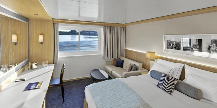 Stateroom size: 409 sq ft (includes private veranda) River-view suite with full-size veranda off a spacious, separate sitting room, and French Balcony (floor-to-ceiling sliding glass door) in sleeping quarters Queen-size Viking Explorer Bed (optional twin-bed configuration) with luxury linens & pillows Free Wi-Fi (connection speed may vary) Flat-screen TV with infotainment system featuring a selection of live TV channels, complimentary Movies On Demand and in-house programming Additional flat-screen TV in sitting area 110/220 volt outlets & USB ports Private bathroom with spacious glass-enclosed shower, heated floor, anti-fog mirror & hair dryer Premium Freyja® toiletries Plush robes & slippers Telephone, safe, refrigerator Individual climate control Bottled water replenished daily Binoculars Stateroom steward & twice-daily housekeeping Under-bed suitcase storage space Roomy wardrobe with wooden hangers View the Veranda Suite (AA) in our 360° Tour